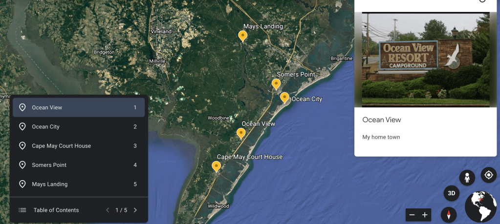 This is my collection of placemarks from Google Earth. I added a different placemark for each location that I included. The first location that I decided to include is Ocean View. This is where I was raised and where I currently live. I also work at a school in this area. The second location that I decided to placemark is Ocean City. This is where I attended high school, worked a few jobs, and currently work at a school. The third place in my project is Cape May Court House. I work at a school there in the summer. The next location that I included is Somers Point. This is where I currently work. The last location that I included in my project is Mays Landing. Mays Landing is where I currently attend school. I added an image to each placemark by getting an image off of Google. To add each placemark, I typed in a location in the searchbar and clicked the button to add the placemark.